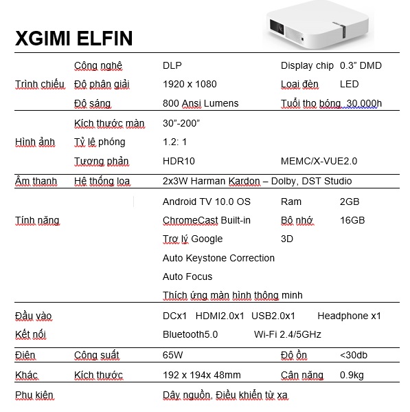 Máy chiếu di động XGIMI Elfin Mini hỗ trợ 4K xem Phim và game, Android TV 10.0, 800 ANSI Lumens, HDR 10, Loa Harman Kardon, Auto Keystone, Tự động lấy nét , 800ansi , upto 300
